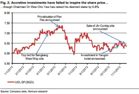 This chart shows UOL's failure to boost share price through accretive investments