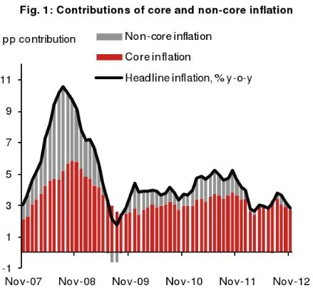 Core inflation has for some time now been running above CPI inflation, in part reflecting the strength in domestic demand. However, disinflationary forces from non-core items have been powerful, keeping headline inflation at low levels for most of 2012, hence helping inflation expectations remain in check.