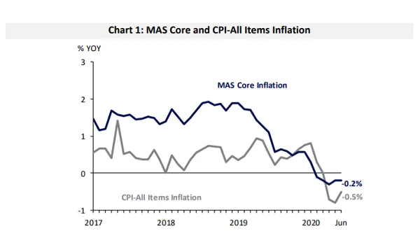 MAS core inflation dipped 0.2% YoY in June, unchanged from May, no thanks to a steeper drop in the cost of services, according to the Monetary Authority of Singapore and the Ministry of Trade and Industry.