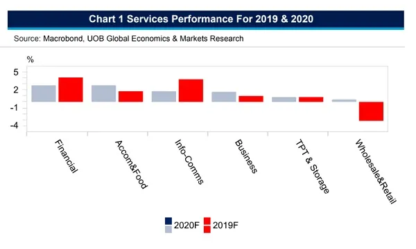 UOB cited three key drivers that informed the analysts’ bullish outlook on the island’s economy for the next year. Firstly, the services sector is expected to continue driving Singapore’s growth into 2020, supported by the finance & insurance and accommodation & food services clusters, which are expected to grow 3.5% and 2% YoY, respectively.