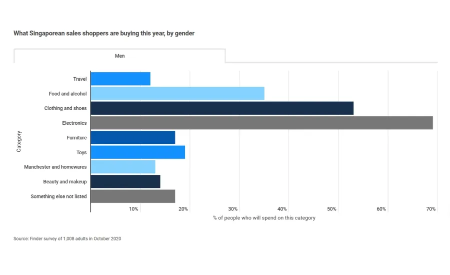 On average, each Singaporean is set to spend $450 for items such as clothing and shoes, electronics, and food and alcohol. To find the estimated national spend and average spend across demographics, Finder.com used the midpoint of each spend range (for example, $25 for those who said they would spend between $1-$49).