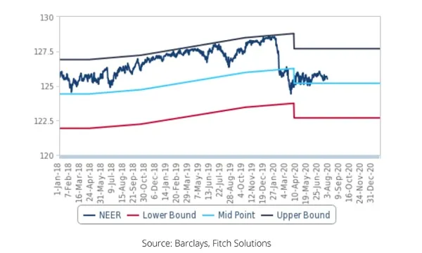 The current range of the NEER between 124 and 126 is likely close to the midpoint of the policy band, which according to estimates from Barclays lies close to 125, strengthening Fitch’s for the MAS to remain on hold.
