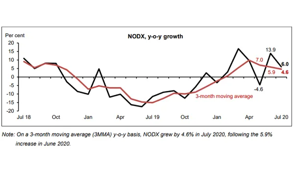 On a MoM seasonally adjusted (m-o-m SA) basis, NODX rose 1.2% in July, after the previous month's 1.4% decline. The level of NODX reached $14.1b in July from $14b in June.