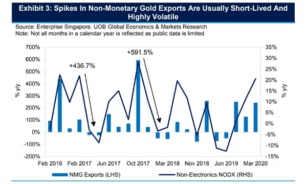 In a note, UOB explained that the factors that led to the positive growth in March may be transient in nature, as it is uncertain if non-monetary gold (NMG) exports, which boosted NODX for the month, can continue to buoy Singapore's external trade for long.