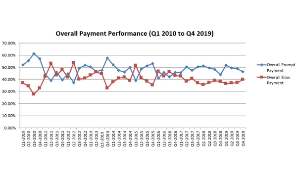 As for the construction industry slow payments climbed 2.52 ppt to 49.42% in the same quarter from 46.9% in Q3 2019, blamed on payment delays by special trade contractors. Slow payments in the building construction sector grew 2.16 ppt from 49.34% in Q3 2019 to 51.5% in Q4 2019, whilst slow payments within the heavy construction sector also rose 1.46 ppt from 44.36% in Q3 2019 to 49%.