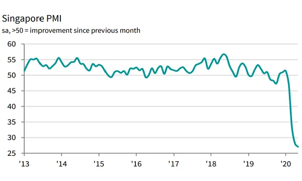 Singapore’s purchasing managers’ index (PMI) fell to 27.1 in May from 28.1 in April, according to data from IHS Markit. This signals further deterioration in the country’s private sector amidst COVID-19.