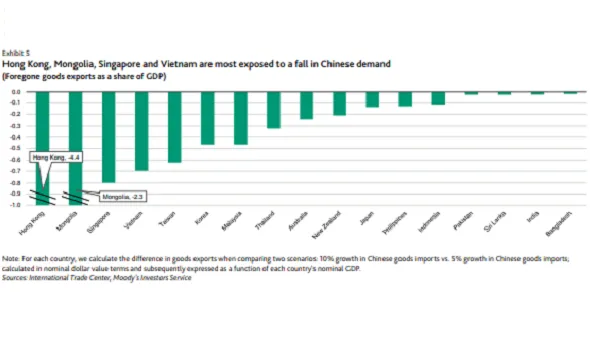 Singapore trails Hong Kong and Mongolia to rank third in Asia-Pacific countries that display the greatest exposure to a slowdown in Chinese demand, according to a report from Moody’s.