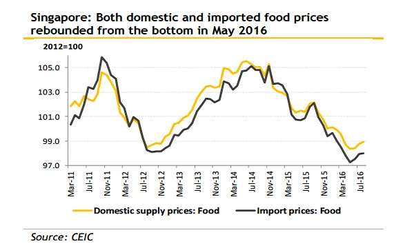 "Prices were unchanged on MoM basis as the lower price of non-cooked food items was offset by the higher cost of hawker meals. These non-cooked items include breads & cereals (Oct 2016: -0.1% MoM; Sep 2016: +1.2% MoM), fruits (Oct 2016: +0.2% MoM; Sep 2016: +1.1% MoM) and meat (Oct 2016: -0.7% MoM; Sep 2016: +1.1% MoM) while costs of hawker food and catered food edged up by +0.2% and +0.6% respectively," the firm explained.