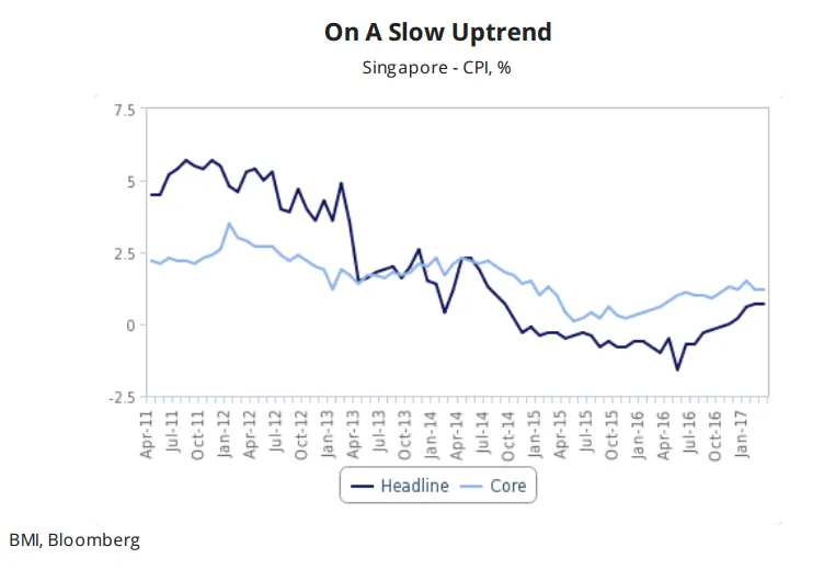 Singapore inflation has been on a slow uptrend since July last year, as this chart from BMI Research showed.