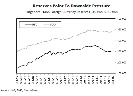 “Effectively, the MAS's SGD policy has put the central bank in somewhat of a tough position, wherein it has been forced to prevent more aggressive SGD weakness versus the US dollar by tapping its reserves even as the currency has appreciated against another group of integral trade partners. Versus a peak of USD278.0bn in June 2014, Singapore's reserves in US dollar terms have fallen by 8.9% over the past year (based on June 2015 data). While much of this is due to valuation effects, reserves have declined slightly in SGD terms (coming in at SGD341.0bn in June 2015, versus SGD346.2bn in June 2014),” BMI Research said.