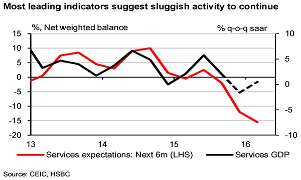 This chart from HSBC shows that net expectations in the services sector indicates no sign of picking up in 2H, and looks set to continue the downward slide in which it has been stuck since mid-2015.