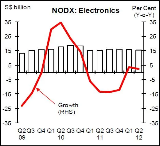 On a y-o-y basis, domestic exports of electronics (comprising 34 per cent of NODX) grew by 2.2 per cent in 2Q 2012, following the rise of 3.5 per cent in 1Q 2012. The expansion in electronic NODX can be attributed to higher domestic exports of ICs (+7.7 per cent), telecommunications equipment (+69 per cent) and disk drives (+26 per cent).