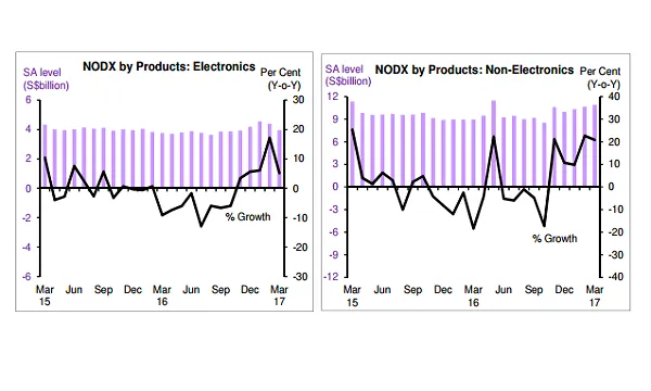 Singapore's non-oil domestic exports (NODX)'s recent growth was partly due to the robust electronics sector, which in March saw a 5.2% improvement in exports.