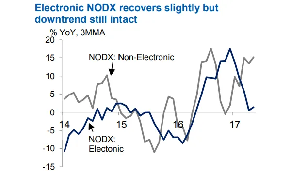 This chart from RHB Research shows electronic NODX in 2017 tumbled 5.3% YoY, dragged by declining shipments of semiconductors and parts of personal computers as well as slowing exports of PCs and telecommunications equipment.