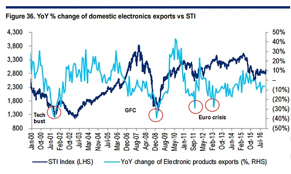According Citi Research, a YoY bottom in the growth rate of electronics exports coincided with that in the STI during the tech bust in 2001, GFC in 2008, and Eurozone debt crisis in 2011. Bottoming in YoY % growth of electronics exports also coincided with bottoming in YoY % GDP growth during the tech bust in 2001, and GFC in 2008.
