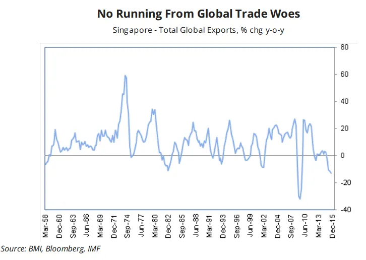 This chart from BMI Research shows that Singapore’s real export growth is forecasted to hover at a measly 1.5% in 2016, following several consecutive months of contraction in 2015.