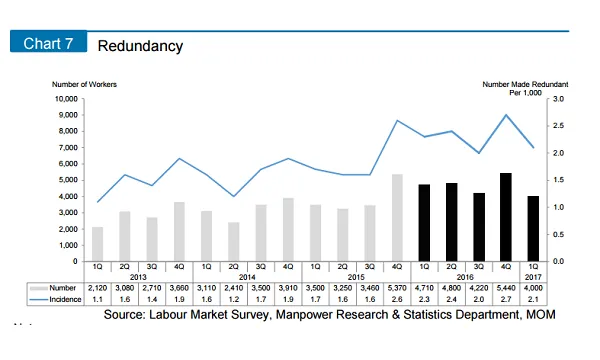 According to the Ministry of Manpower, 4,000 workers were made redundant in the first quarter of 2017, lower than the past quarter (5,440) and the same period a year ago (4,710).