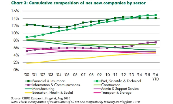 According to a report by CBRE Research, in terms of total number of net new companies formed, financial and insurance activities; professional, scientific and technical activities; as well as the information and communications are three of the largest and fastest growing sectors.