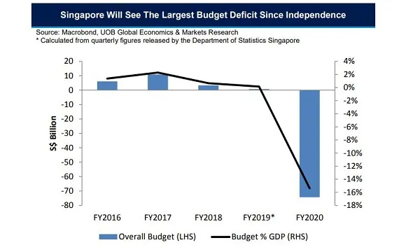This chart from UOB shows the overall budget deficit for FY2020 which amounts to $74.3b or 15.4% of GDP. This is up from the previous budget deficit estimate of $44.3b or 8.9% of GDP and said to be the largest budget deficit in Singapore’s history.