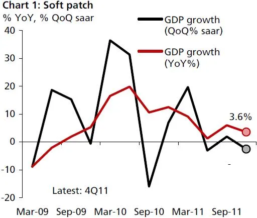 “The economy contracted by 2.5% QoQ saar in the last quarter. This brought the year-on-year headline growth figure to 3.6% and thus delivered a full year GDP growth of 4.9% for 2011,” said DBS.