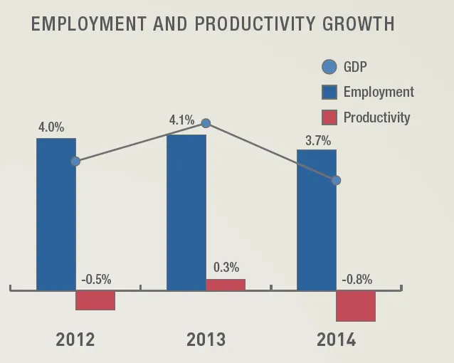 Productivity sank into the red again in 2014. Overall labor productivity declined by 0.8% last year, a reversal of the meagre 0.3% productivity growth recorded in 2013.