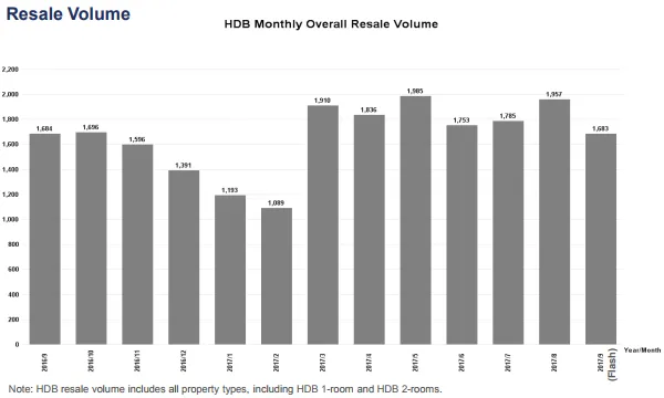 This chart from the SRX Residential Property Flash Report shows the resale volume of all HDB flats fell from 1,957 in August to 1,683 in September.
