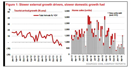 CIMB adds that locally, dwindling tourist arrivals hit some hotels and retail malls, while credit restraint hit home sales, car sales, white goods sales and adspend. Rising costs also made some retailers (Dairy Farm) suffer vs. their low-cost rivals. For regional consumer plays, Thai woes and weaker ASEAN currencies were a bane for corporate earnings.