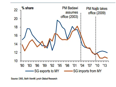 Historically, Dr Mahathir’s proposed “crooked bridge” to replace the causeway was the epitome of Malaysia-Singapore’s tense relationship. BaML says that only when PM Badawi took over the premiership in 2003 was there a warming of bilateral ties.