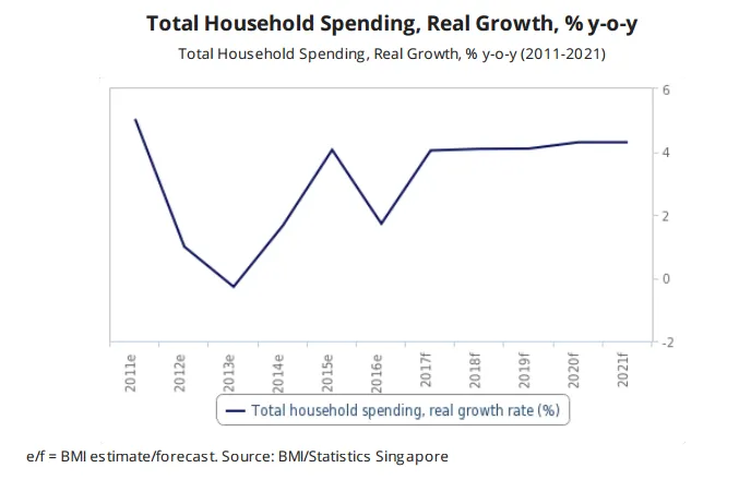 According to BMI Research, total household spending will jump from this year's $156.97b (US$113.4b) to $227.2b (US$164.1), growing at an average annual rate of 8.3% between 2017 and 2021.