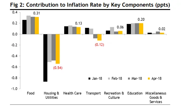 Meanwhile, the contribution of food prices stayed still at 0.31 ppt. The contribution of healthcare prices and miscellaneous goods dipped to 0.13 ppt and 0.02 ppt respectively. Contributions slightly rose for recreation & culture (0.06ppt) and education (0.20ppt), reflecting higher prices.