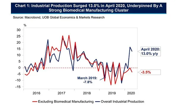 This chart from UOB shows that the industrial production in Singapore surged 13% YoY in April. This is said to be attributed to the strong biomedical manufacturing cluster which grew 100.5% YoY.