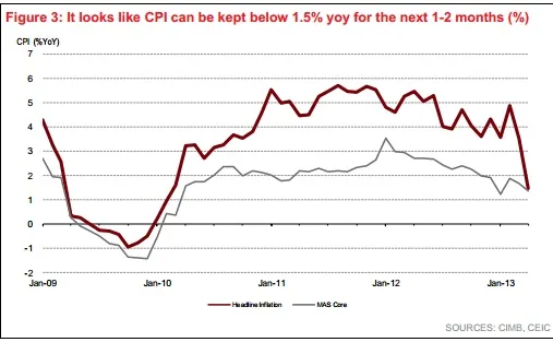 According to CIMB, 1Q13 CPI averaged 4.0% yoy, unchanged from 4Q12, with the MAS’s core CPI down to a 3-year low of 1.6% yoy (2.0% in 4Q12). May’s CPI may drift below 1.5% yoy on the back of further declines in COE premiums in Apr even though housing costs could rebound in the absence of S&CC rebates.