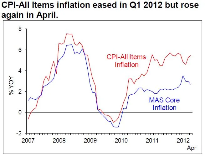 Reflecting the pickup in services inflation, MAS Core Inflation, which excludes the costs of accommodation and private road transport, rose from 2.4% in Q4 2011 to 3.1% in Q1 2012. In April 2012, CPI-All Items inflation came in higher at 5.4%. The increase largely reflected the higher contribution from accommodation, which was due to the low base last year when the government disbursed a large quantum of S&CC rebates.
