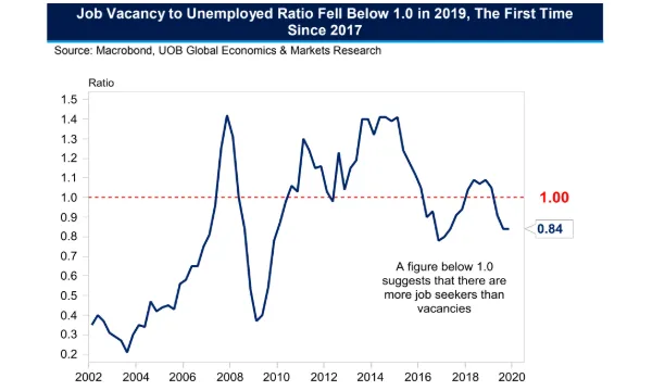 This chart from UOB showed that the ratio of job vacancies to unemployed individuals fell below 1.0 in 2019, the first time since 2017. This suggests that there had been more job seekers than vacancies and that Singapore’s labour market was already softening prior to the COVID-19 pandemic.