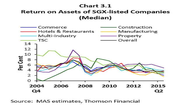 The median return of assets (ROA) of listed companies edged down from 3.9% in Q2 2014 to 3.5% in Q2 2015.