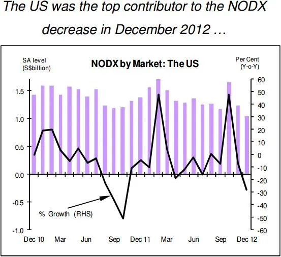 The top three contributors to the NODX contraction in December 2012 were the US, Malaysia, and South Korea.