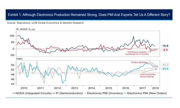This chart from UOB shows that despite the electronics cluster's high output in April (+11.3% YoY), the high base of the electronics cluster from 2017 may result in a slower pace of expansion in the months ahead.