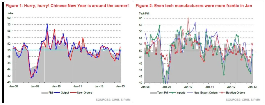 According to CIMB, on the surface, manufacturing got off to a good start with overall and tech PMIs gaining better-than-expected 1.6 pts and 3.3 pts in Jan, to 50.2 and 49.9 respectively.