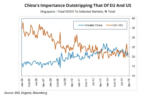This chart shows that China is starting to overtake the European Union and the United States in terms of contribution to the city-state's total non-oil domestic exports (NODX).