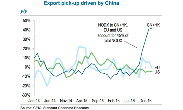 Thanks to the meaningful pick-up in non-oil domestic exports to China.