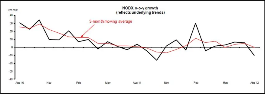 On a y-o-y basis, NODX contracted by 11 per cent in August 2012, in contrast to the 5.7 per cent increase in the previous month. On a 3-month moving average (3MMA) y-o-y basis, NODX expanded marginally by 0.1 per cent in August 2012, following the 5.1 per cent increase in the previous month.