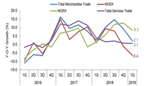 This chart from Enterprise Singapore (ESG) shows that non-oil domestic exports (NODX) slipped 6.4% YoY in Q1 2019, extending the 1.1% dip in Q4 2018, due to decreased shipments of both electronic and non-electronic products.