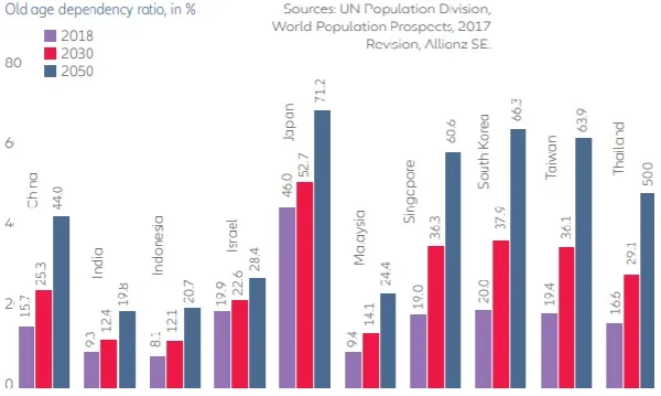 This chart from Allianz Global Wealth Report shows that old age dependency ratio is expected to be rise even further in the next decades.