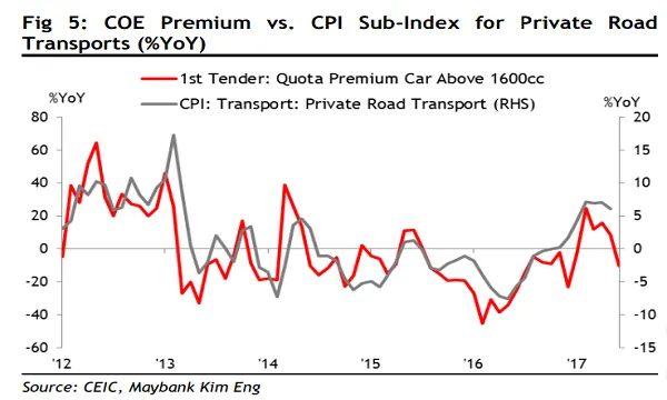 The chart shows how certificate of entitlement premiums also affected private road transport inflation. Latest figures show COE premiums slowed by around YoY. 2%.