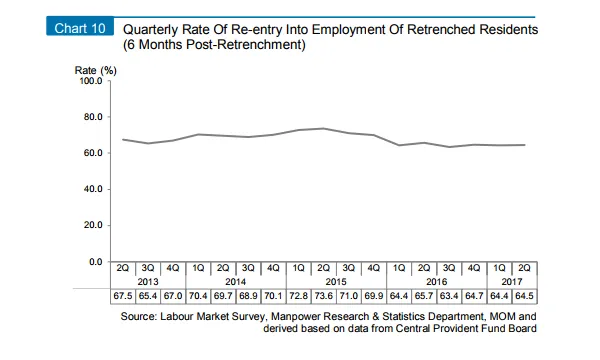 This chart from the Ministry of Manpower (MOM) shows that the re-entry rate amongst retrenched workers hit 64.5% in Q2.