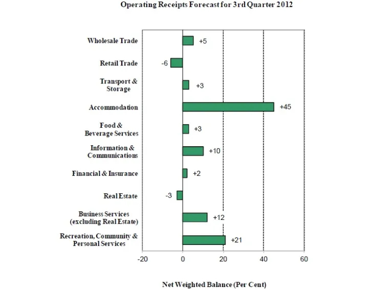 Overall, a net weighted balance of 7% of firms in the services sector forecasts growth in operating receipts for the third quarter of 2012 over the preceding quarter. A net weighted balance of 9% of firms expects an increase in employment level over the same period.