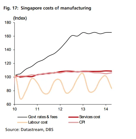 A report by DBS reveals that the F&B, retail and hotel industries are among those affected. Challenges from rising rents, as well as labour cost and shortages are flagged. Meanwhile, foreign worker levies in the construction sector had just increased in July 2014 and will rise further in July 2015. DBS does not expect these cost pressures to abate anytime soon.