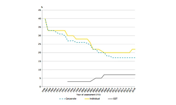 This chart from EY shows the movement of Singapore's actual rates for corporate income tax (CIT), individual, and goods and services tax (GST) from 1986 to 2017. EY assumes there is no change in tax rates in 2018.