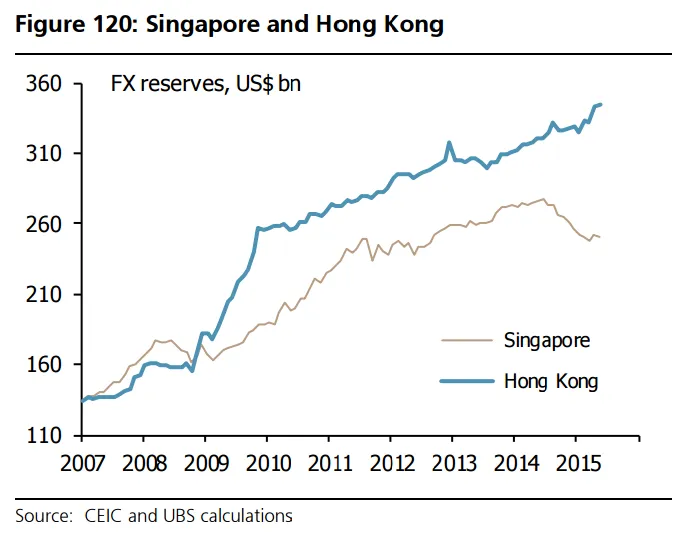 This chart from UBS shows the steep drop in Singapore's official foreign reserves (OFR), which have fallen from a high of around US$278b in June 2014 to US$250.1b in May 2015.