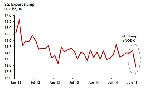 Meanwhile, export sales plunged by 9.4% MoM saar even if we adjust for the seasonal influence. DBS analysts say that that is awful export performance. In fact, the sequential MoM decline in February is the sharpest since Mar12.